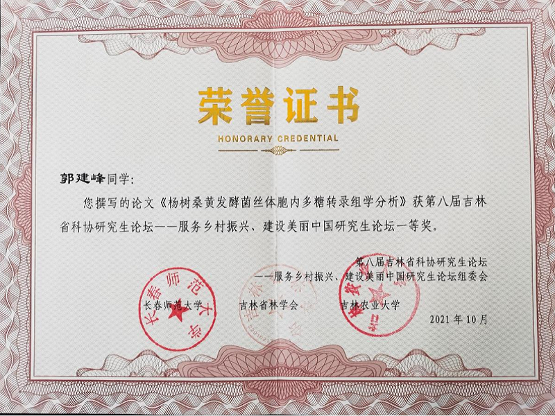 论坛征集论文涵盖了农学、林学、风景园林学、生态学、动物学等多个研究领域,通过专家初审,筛选了部分优秀论文在论坛当天进行了的学术交流答辩,论坛现场吉林省科学技术协会组织多名专家学者对研究生的精彩学术报告进行点评及现场打分,论坛共评选出论文一等奖10篇,二等奖20篇,三等奖25篇,优秀奖若干。经过激烈的角逐,凭借优秀的科研成果和出色的答辩表现,我校由园艺学专业硕士生导师刘迪老师指导的2020级硕士研究生郭建峰同学论文《杨树桑黄发酵菌丝体胞内多糖转录组学分析》荣获一等奖。