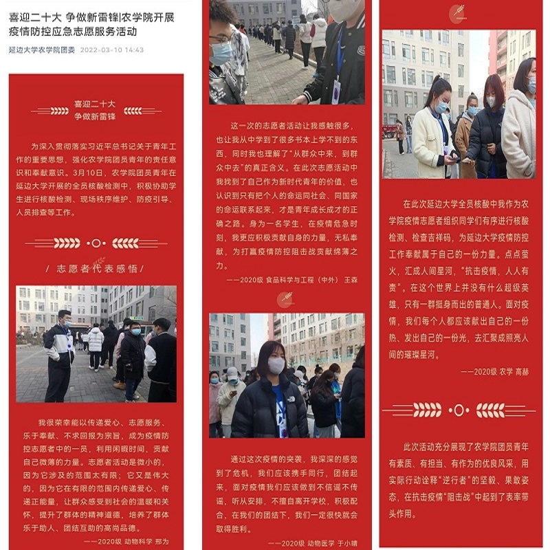 为深入贯彻落实习近平总书记关于青年工作的重要思想,强化太阳城娱乐 团员青年的责任意识和奉献意识。3月10日,太阳城娱乐 团员青年在延边大学开展的全员核酸检测中,积极协助学生进行核酸检测、现场秩序维护、防疫引导、人员排查等工作。