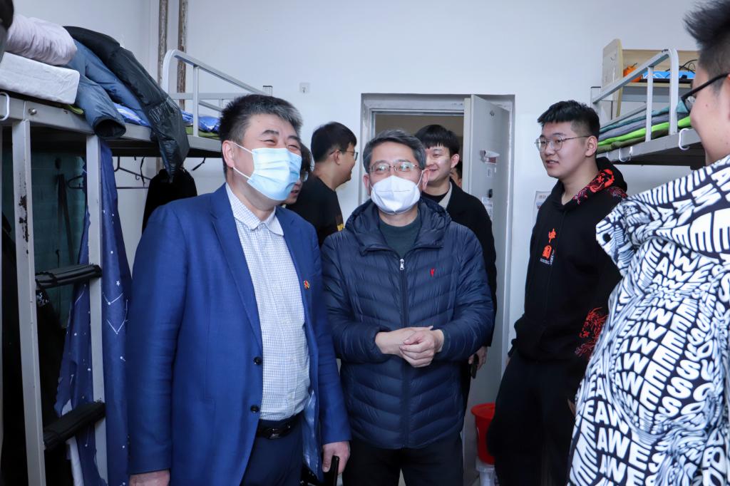 党委书记刘海峰,党委副书记金庆国,学生工作办公室主任姚琳、各专业辅导员深入学生宿舍走访。