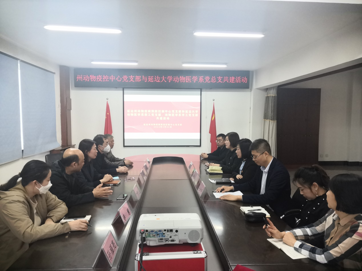 动物医学系主任张雪梅、党总支书记宋建臣、副主任李海峰、动物医学实验教学中心主任动物医院院长梁晚枫、系教工党支部书记孙福亮、系学工党支部书记辅导员李慧和生物技术专业主任于龙政老师等一行赴延边州动物疫病预防控制中心实地考察,座谈交流。