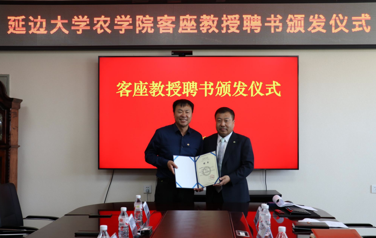 李官浩院长向王云峰董事长颁发客座教授聘书和延边大学校徽