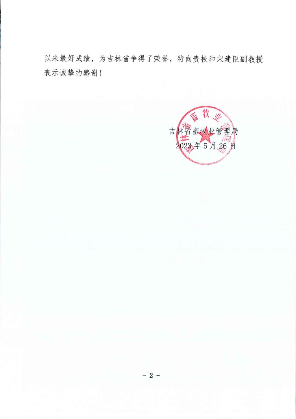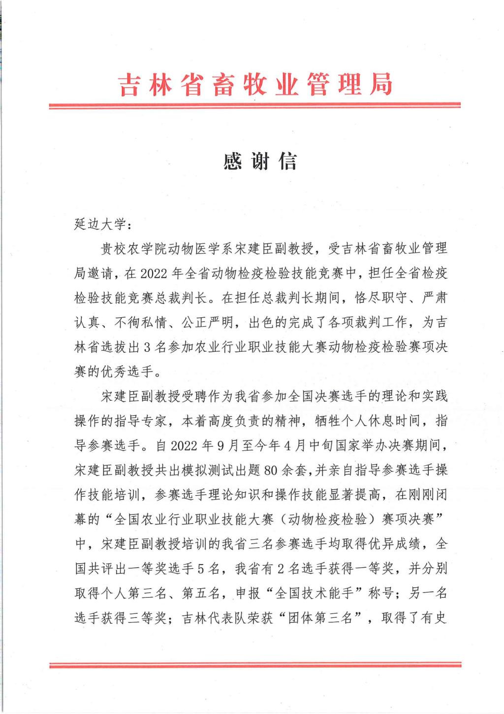 近日,吉林省畜牧业管理局为感谢我院动物医学系宋建臣副教授在2022年全省动物检疫检验技能竞赛中的贡献,特向延边大学发来感谢信。